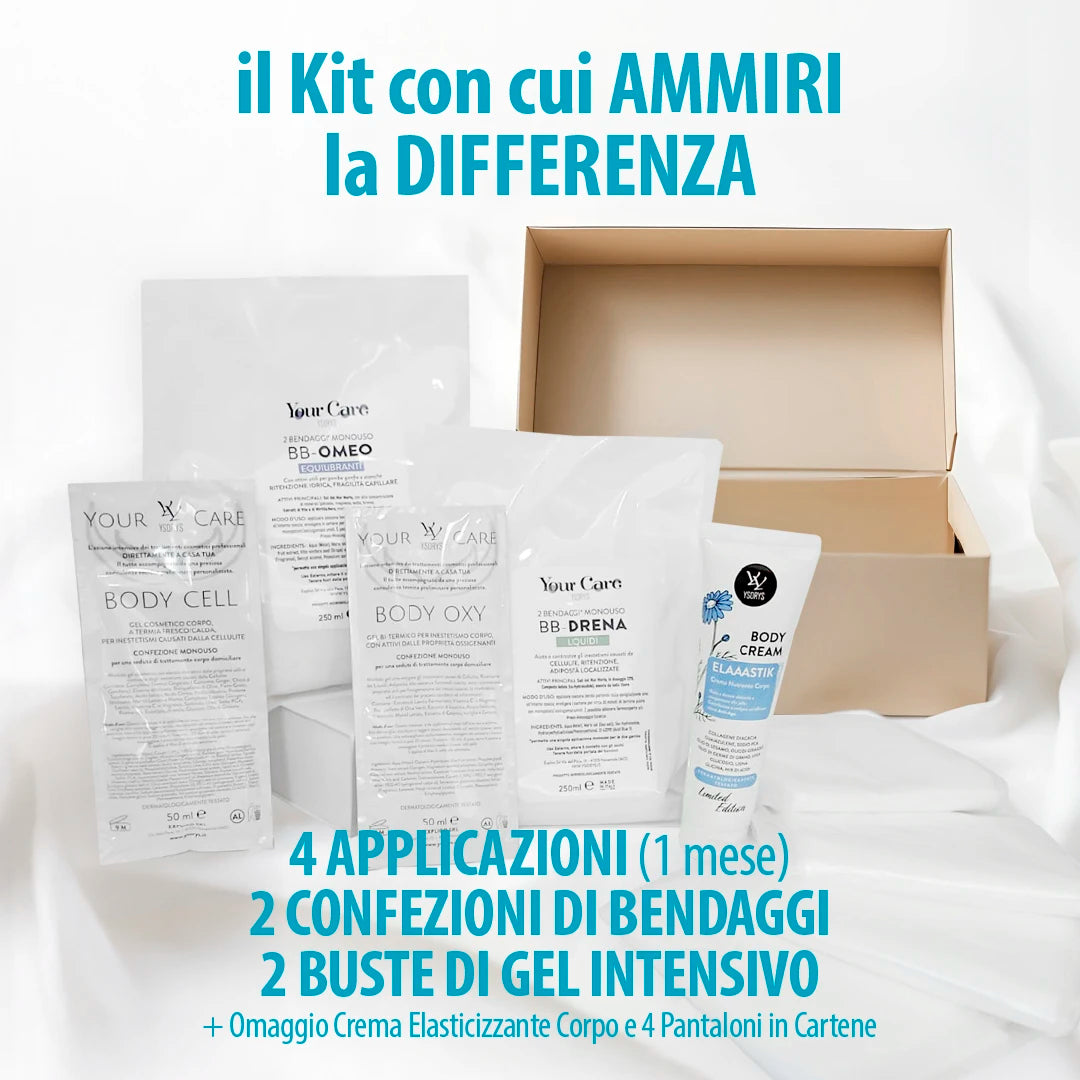 Il BOX è perfettamente strutturato per le 4 sedute sia con la parte cosmetica (BENDAGGIO, GEL e CREMA), che per la parte pratica di utilizzo (PANTALONE IN CARTENE).