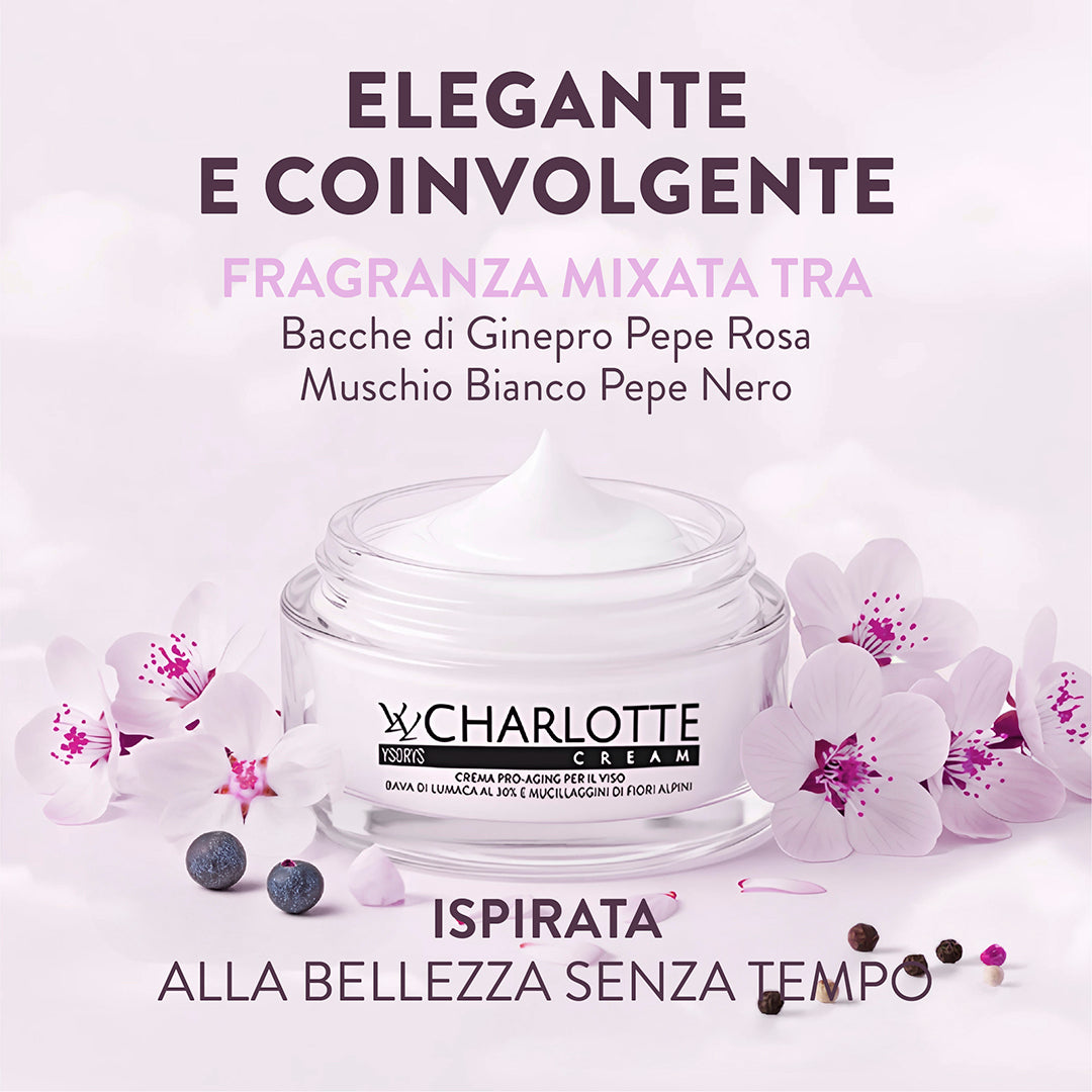 CHARLOTTE Cream è un vero elisir di giovinezza formulata con BAVA DI LUMACA PURA, associata ad un COMPLETO E BILANCIATO COCKTAIL DI MICILLAGINI di estratti botanici di piante e fiori alpini; rappresenta un prodotto lussuoso che contribuisce a rigenerare la pelle in profondità, attenuando le rughe e donando un’idratazione intensa ed una stabile morbidezza.